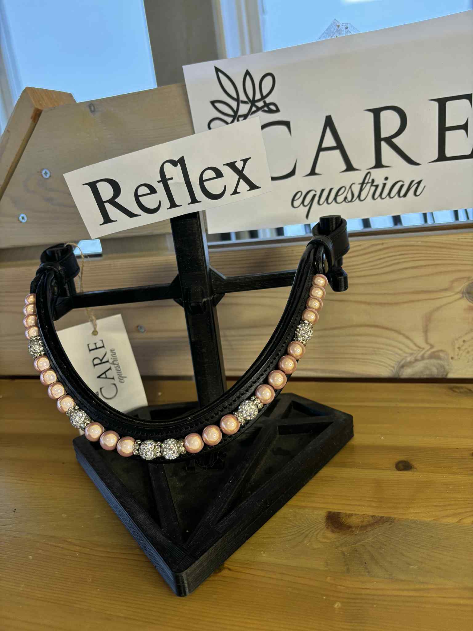 Handsytt pannband från Care Equestrian med reflexpärlor.
